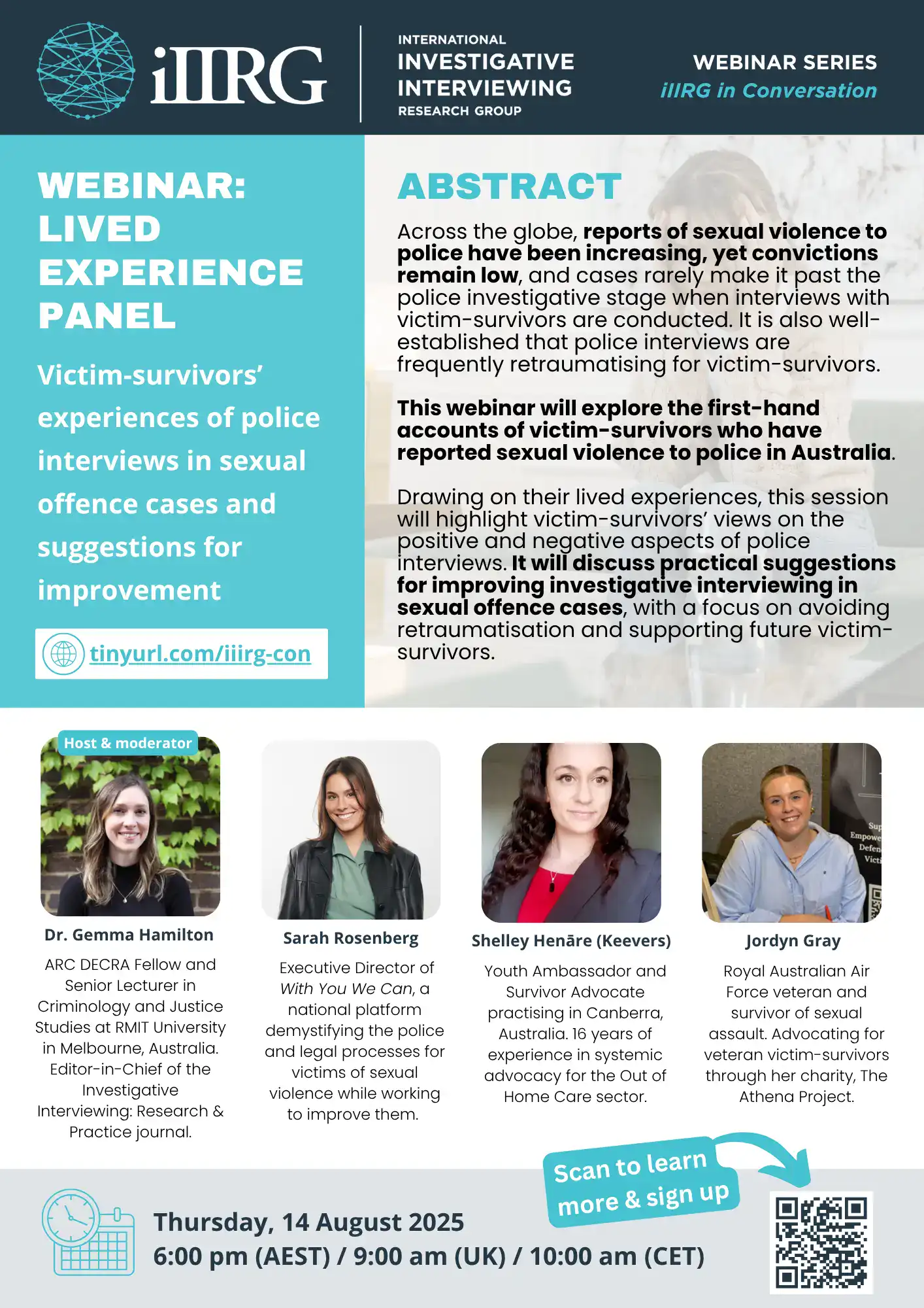 The iIIRG in Conversation webinars feature presentations and conversations with leading academics, practitioners and students across the field of Investigative Interviewing.